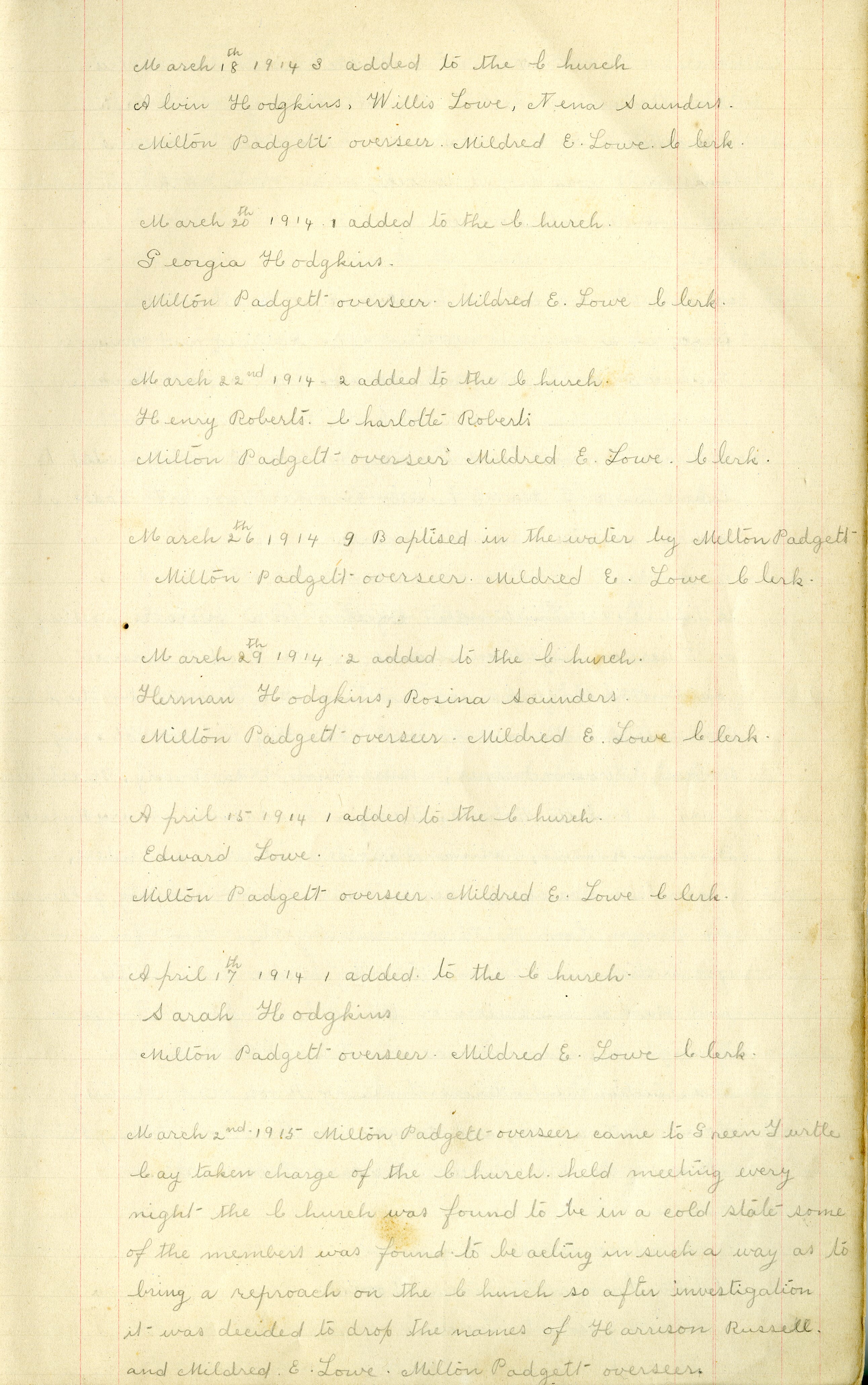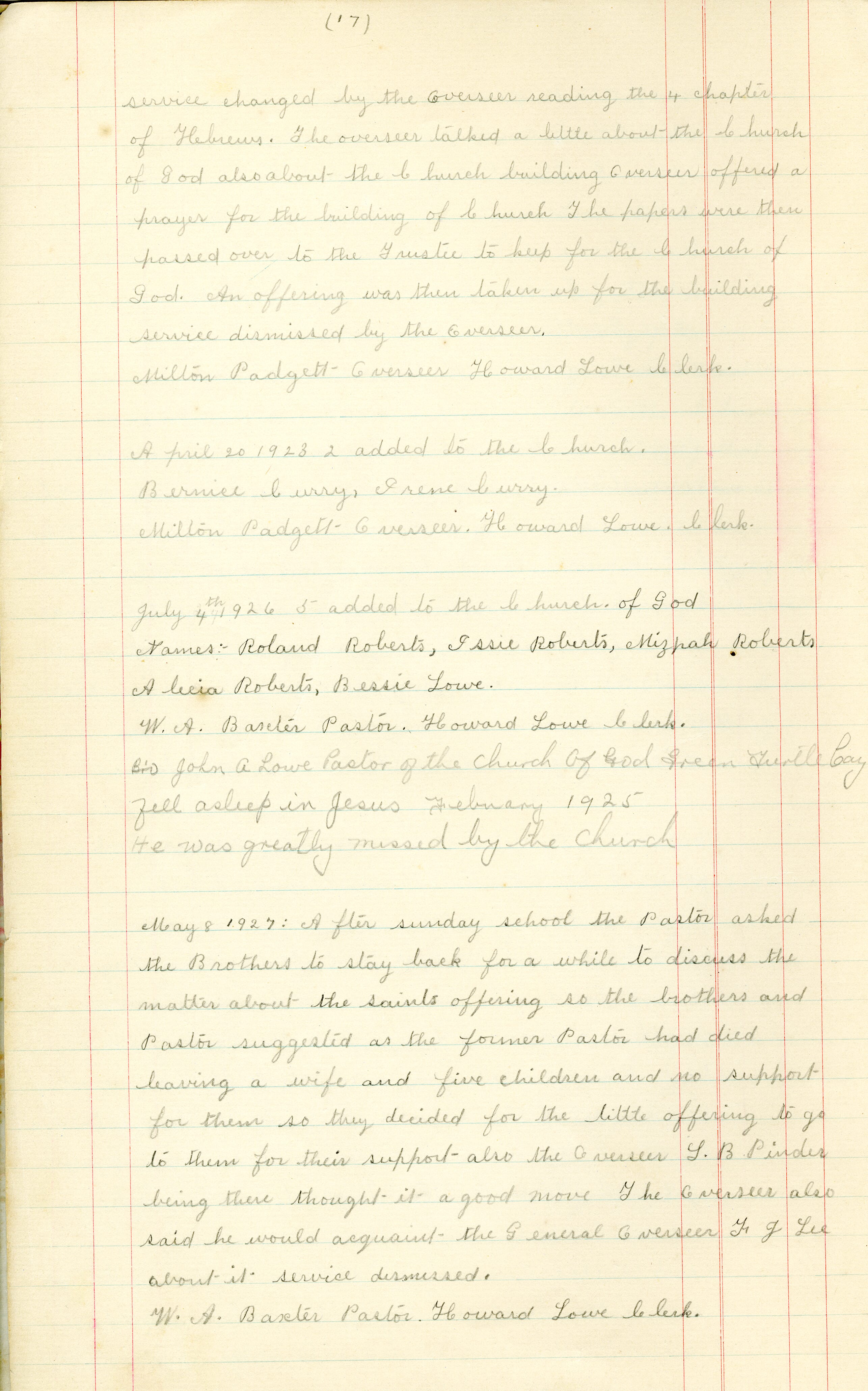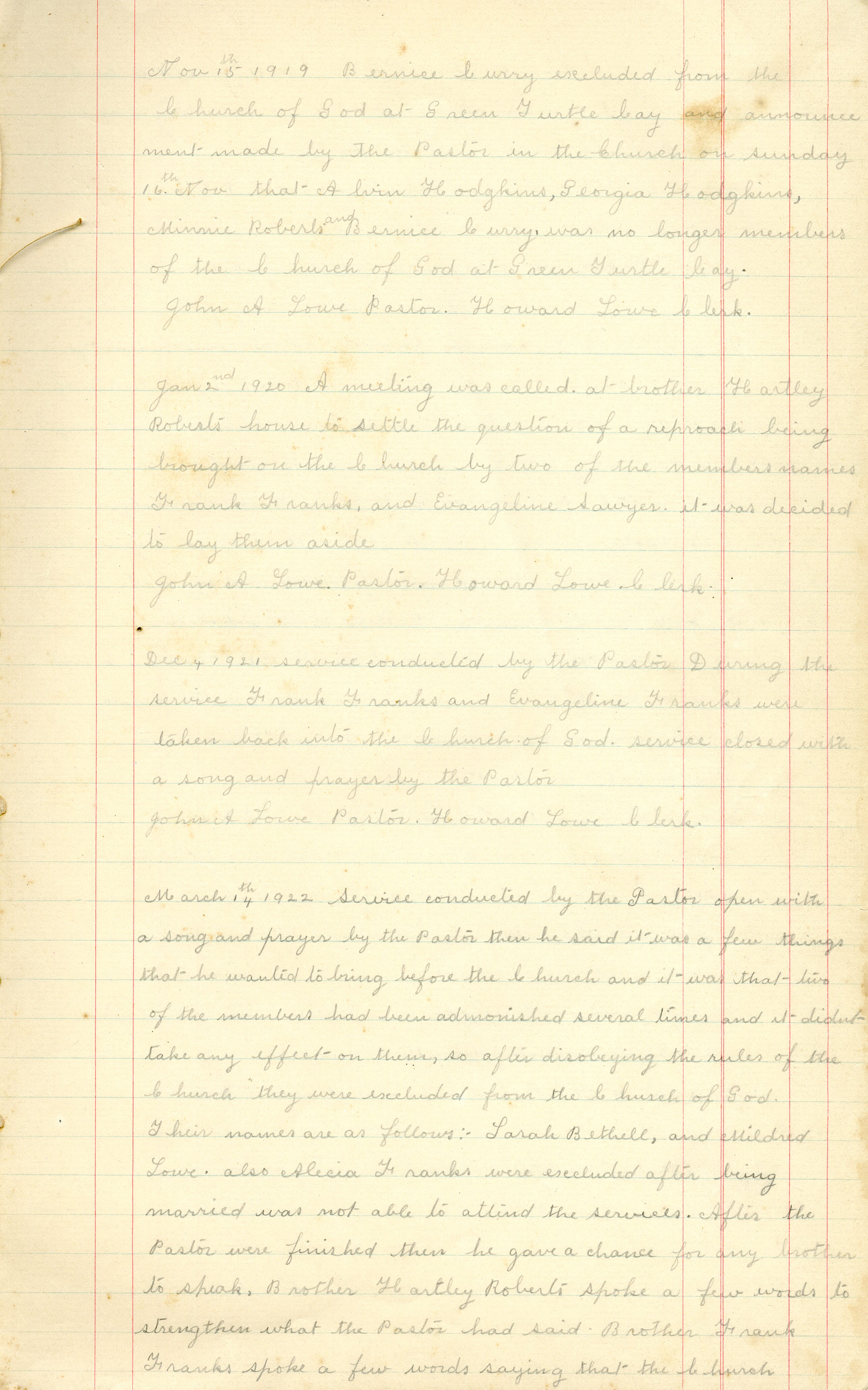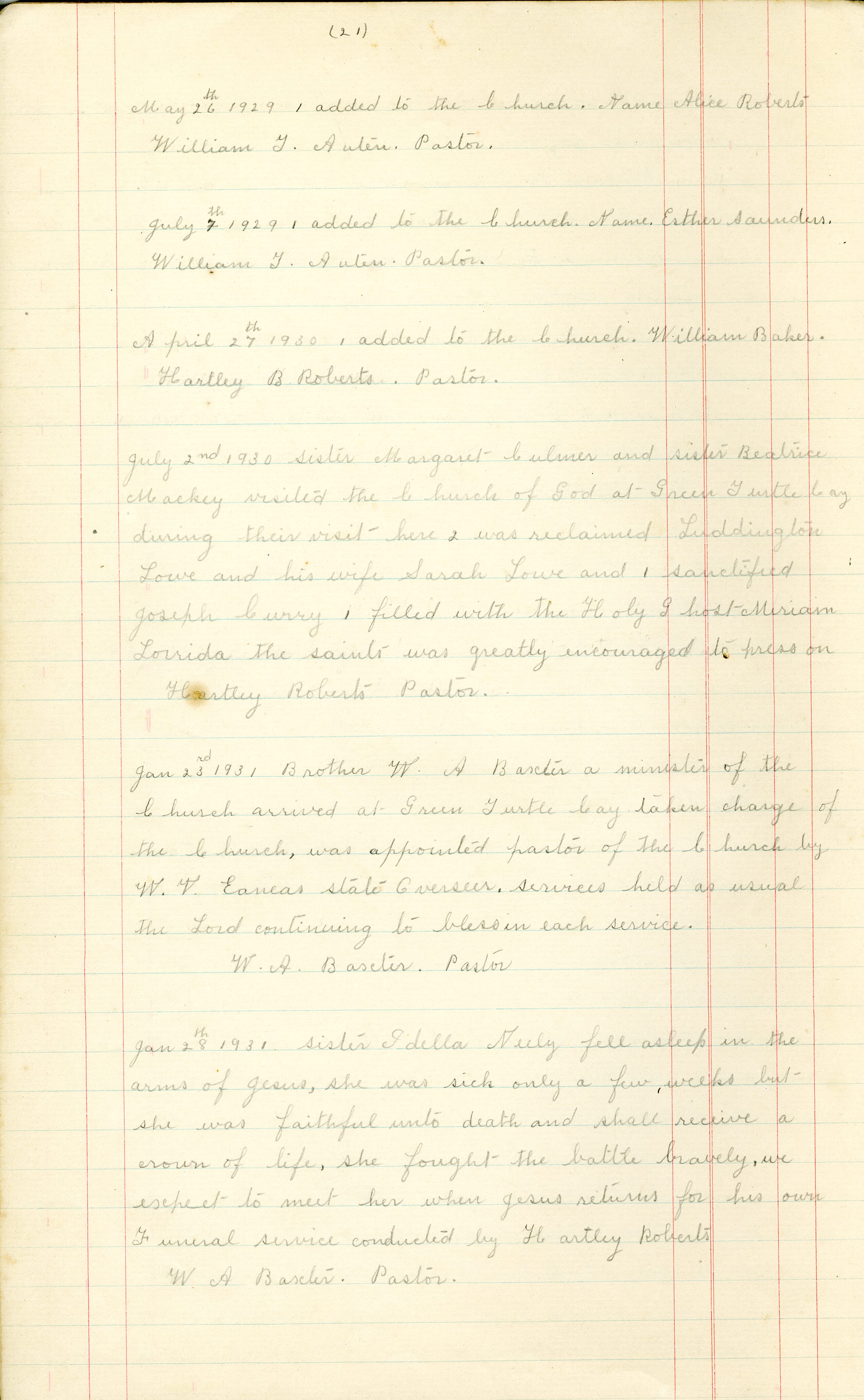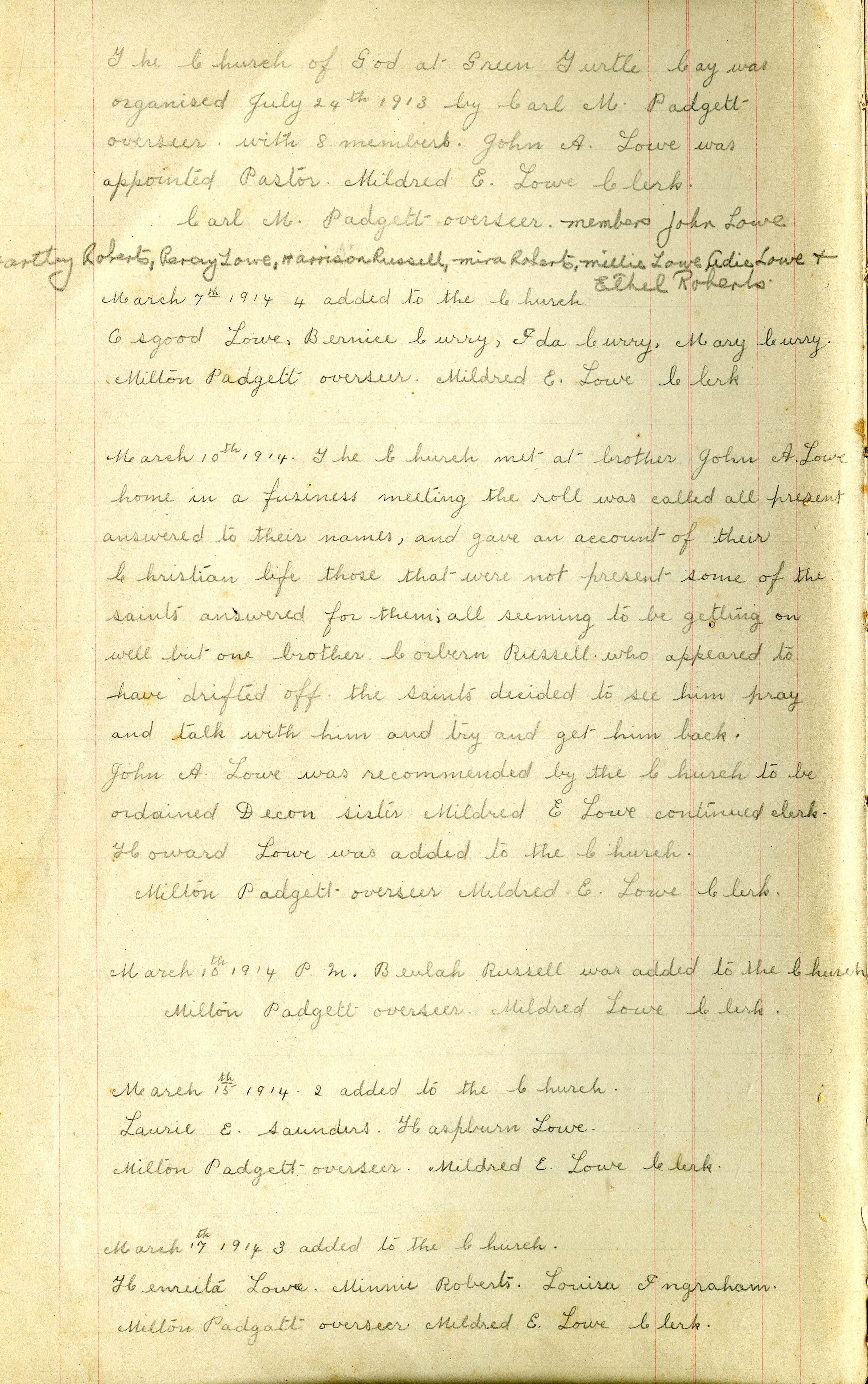 Set in order by Carl M. Padgett on July 24, 1913, the Church of God on Green Turtle Cay in the Bahamas is the oldest active church in the movement outside of the United States. In 2010, the church donated their business meeting records that date back to 1913. The pages below are a portion of the Green Turtle Cay Collection held by the Dixon Pentecostal Research Center. The dates included here range from 1913 into 1931.