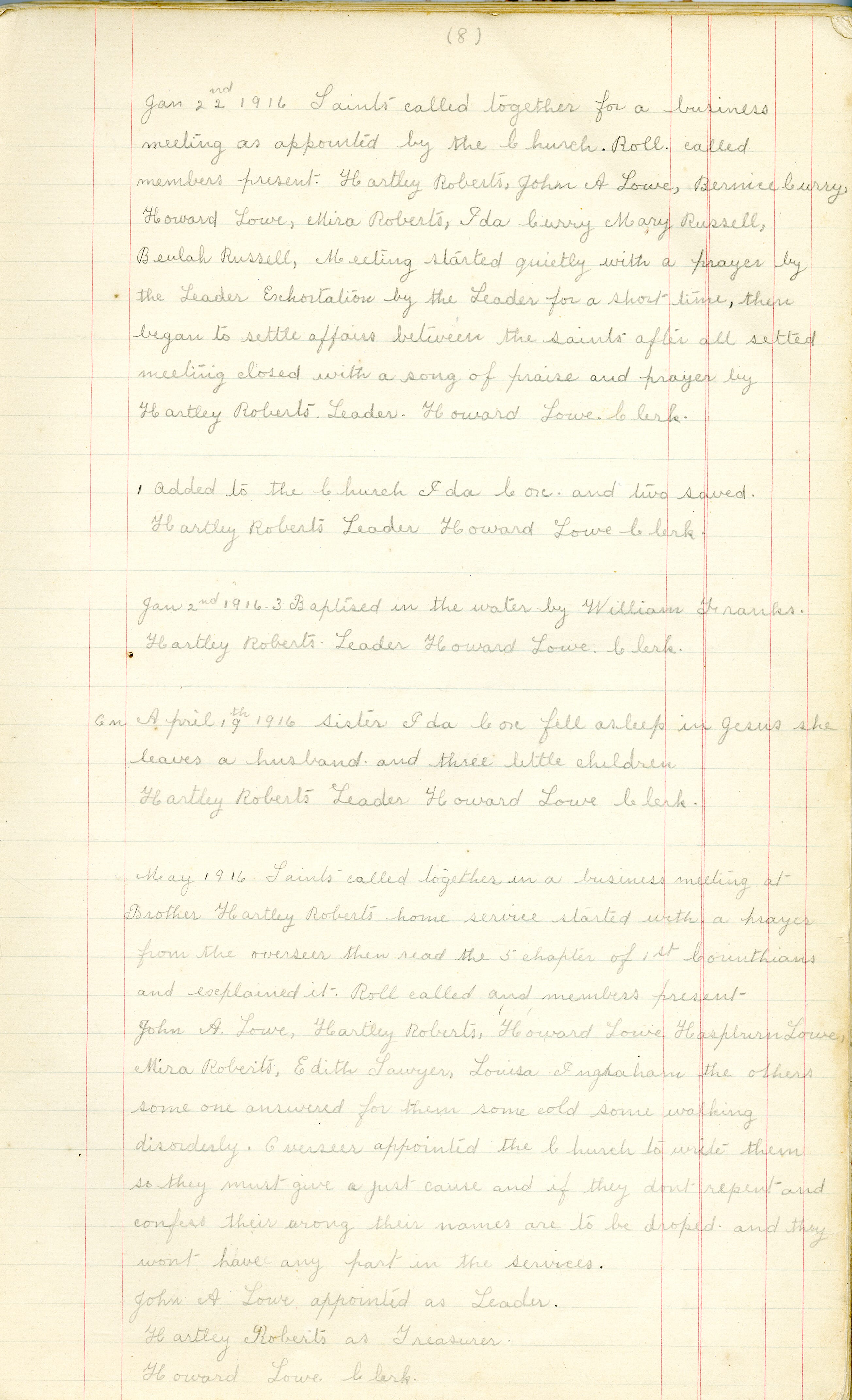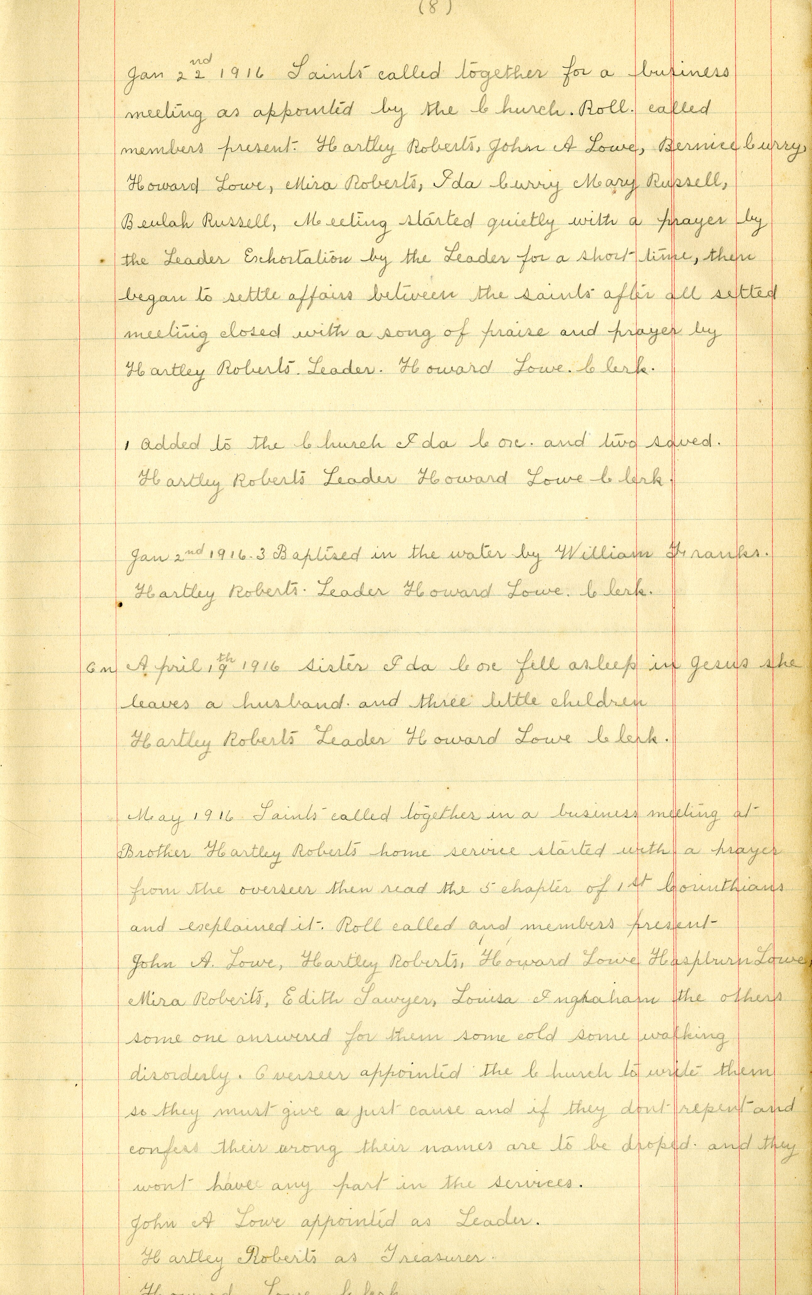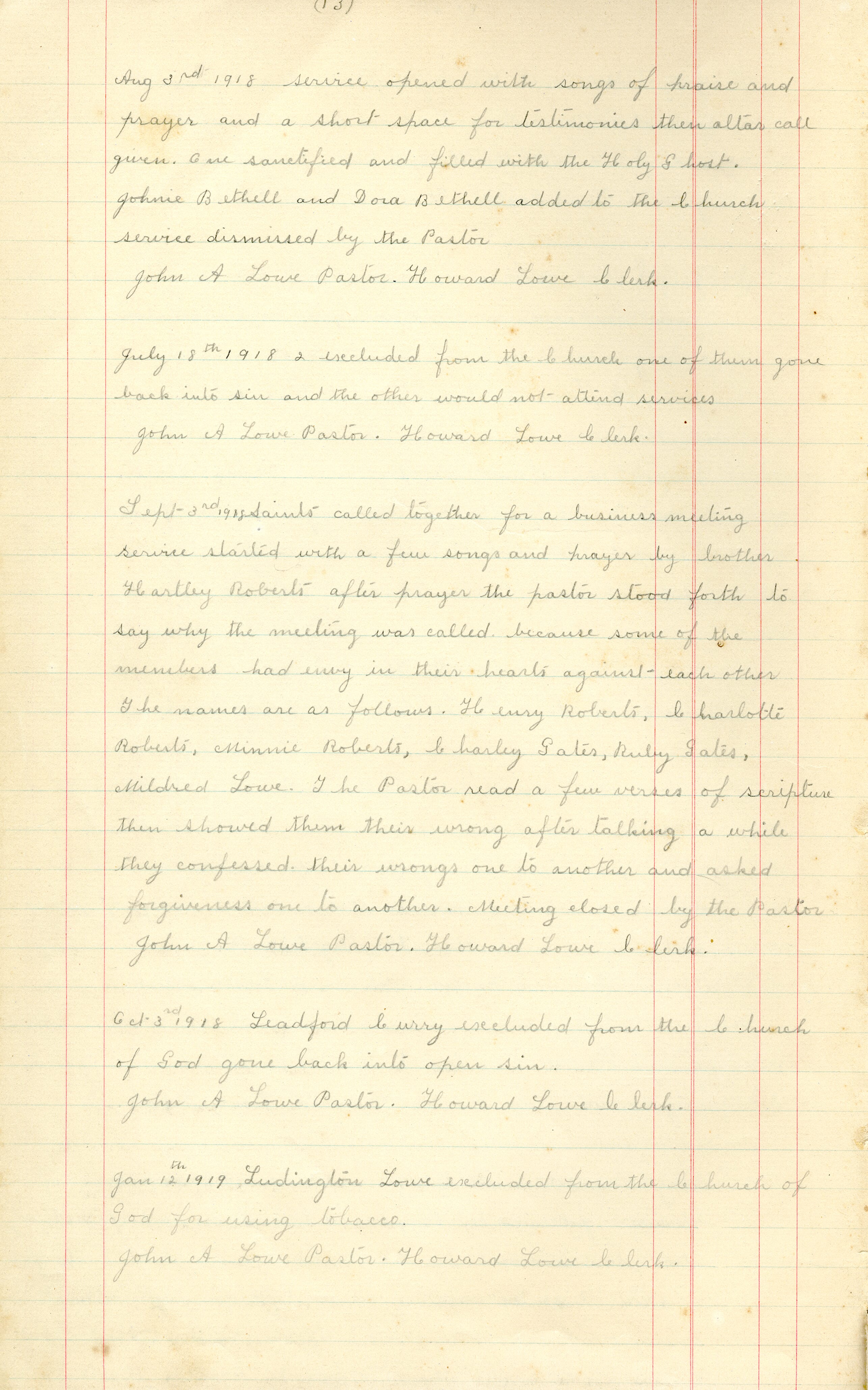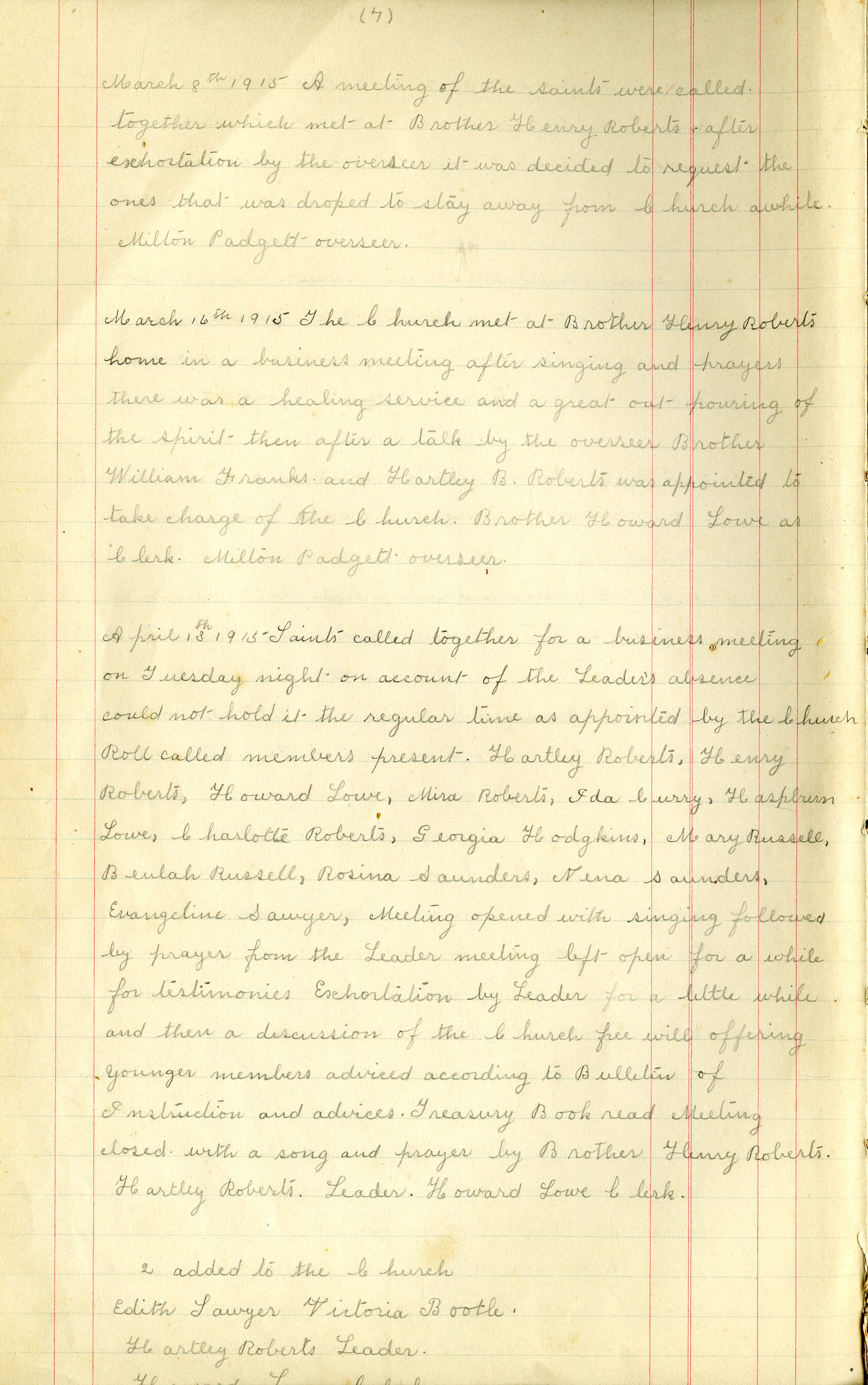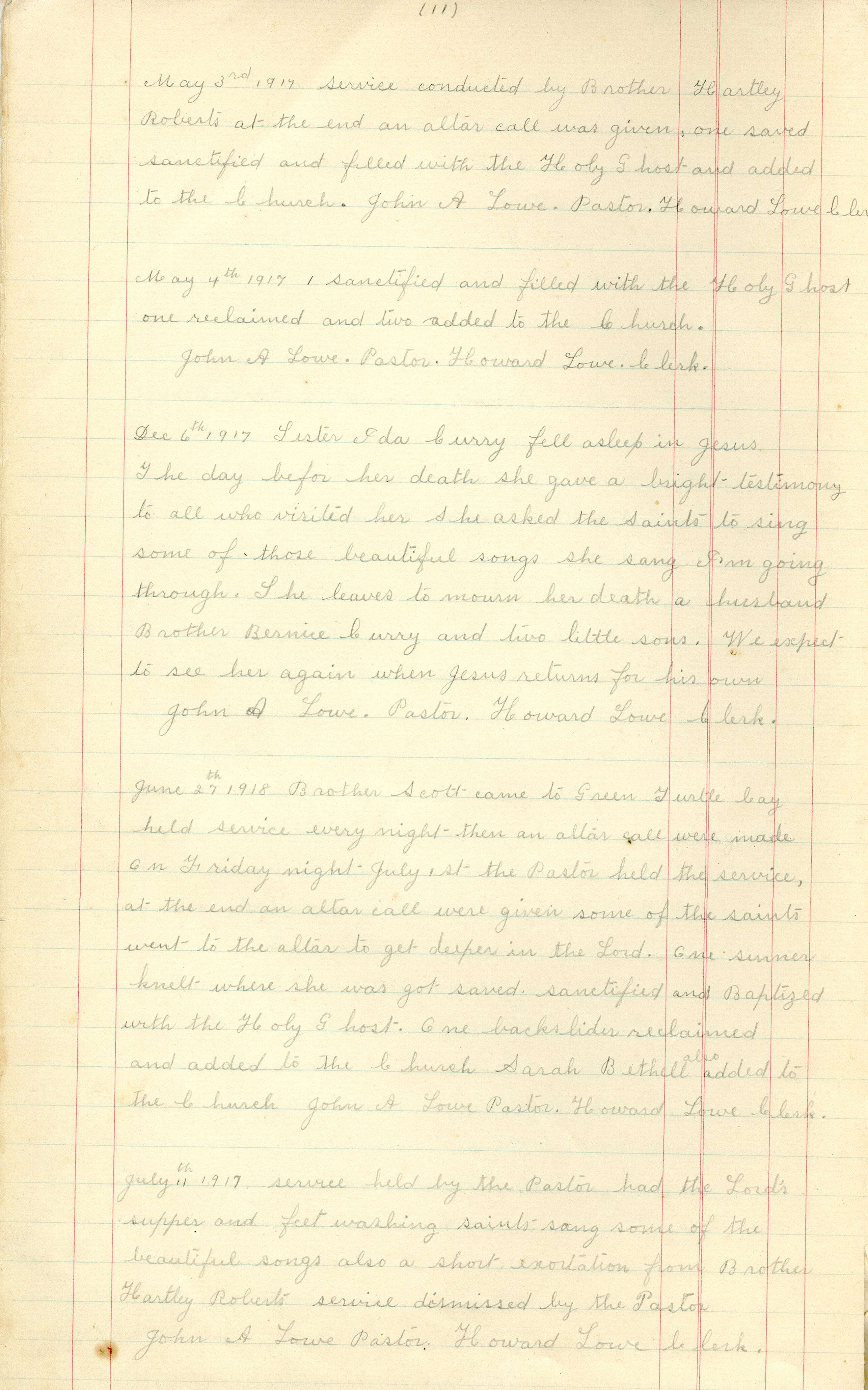 Set in order by Carl M. Padgett on July 24, 1913, the Church of God on Green Turtle Cay in the Bahamas is the oldest active church in the movement outside of the United States. In 2010, the church donated their business meeting records that date back to 1913. The pages below are a portion of the Green Turtle Cay Collection held by the Dixon Pentecostal Research Center. The dates included here range from 1913 into 1931.